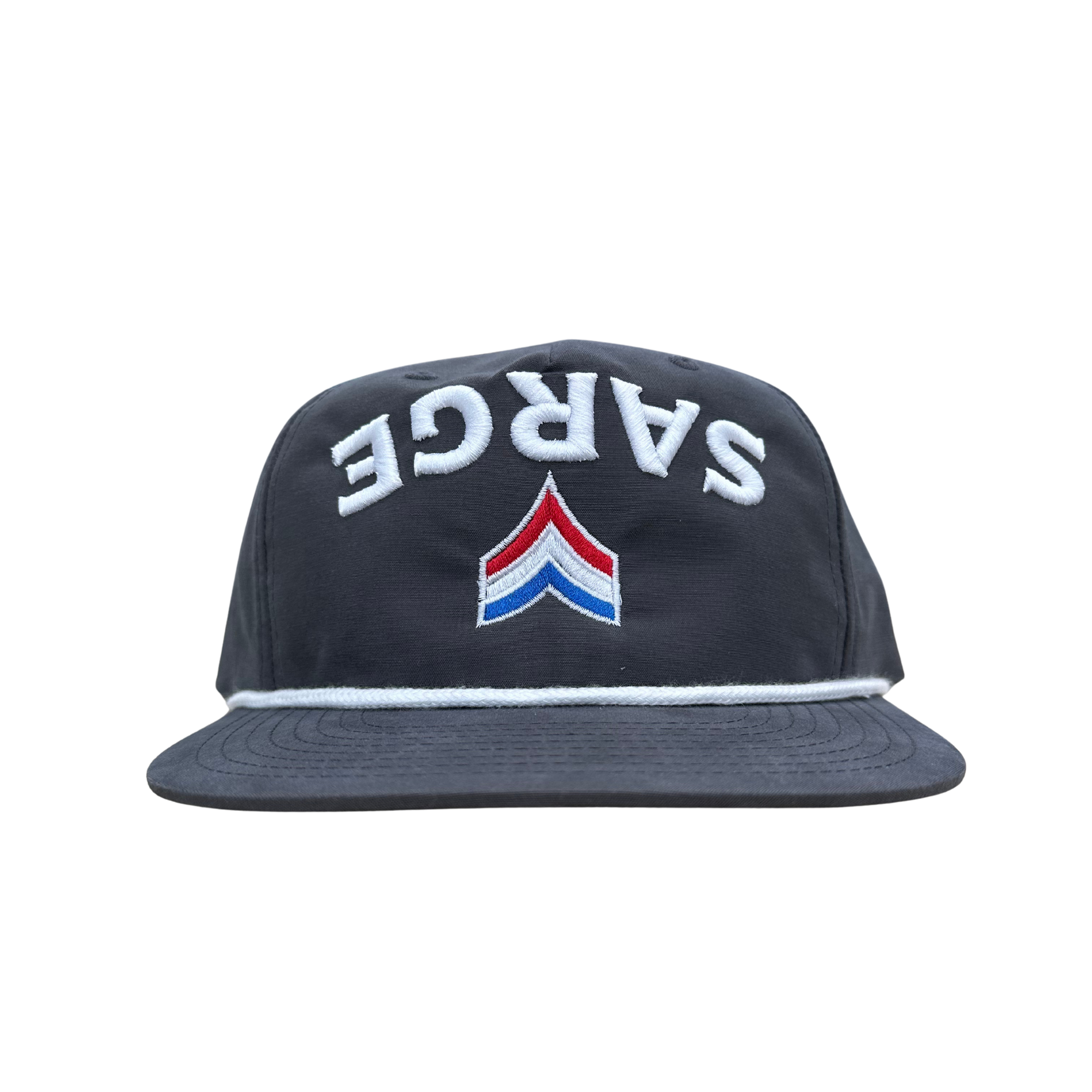 Paired with the red/white/blue chevron and a clean white rope line, this hat takes the classic military-inspired silhouette and turns it on its head… literally.